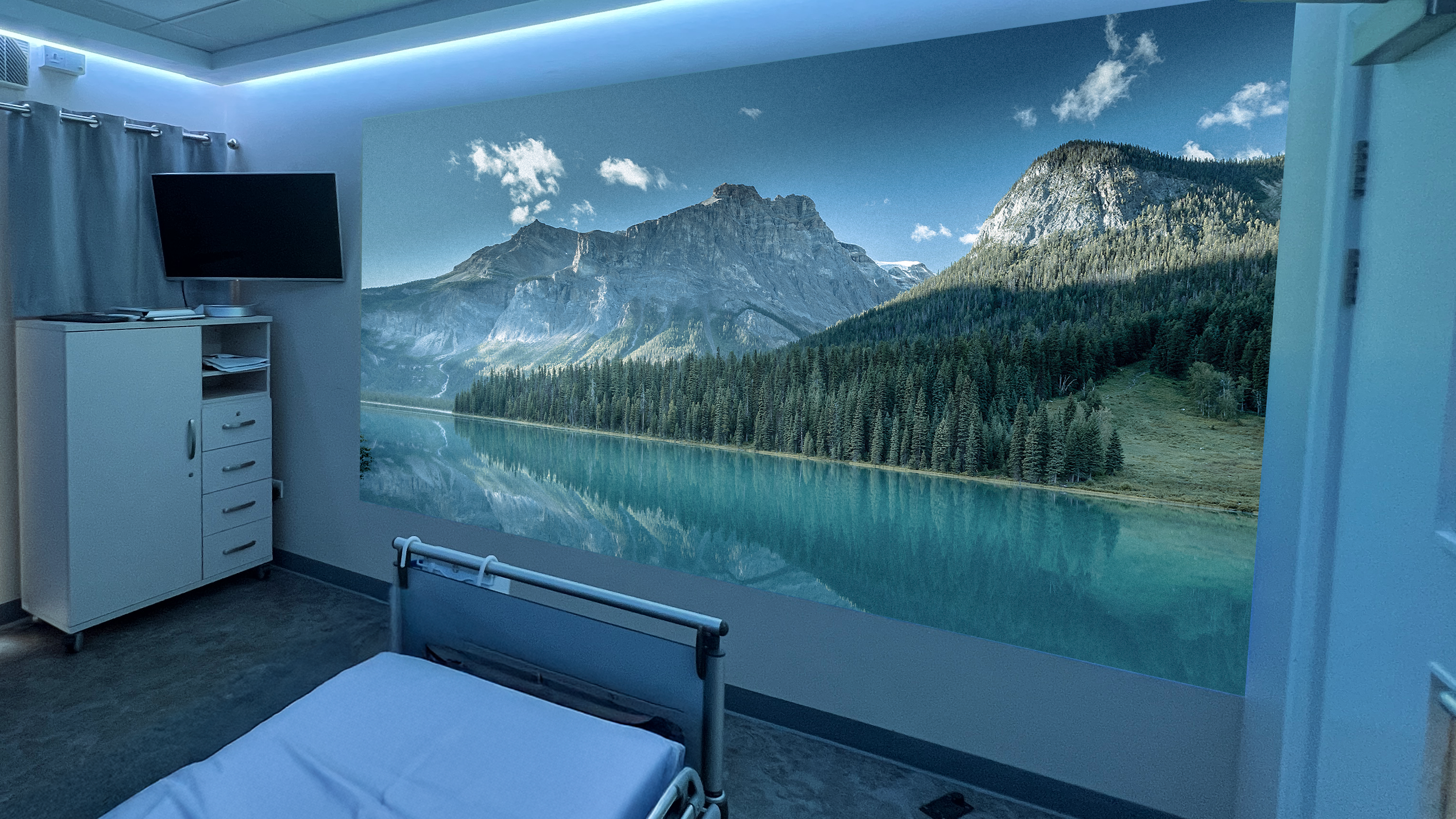 Importantly, the Aurora team struck a thoughtful balance between innovation and preserving familiar comforts. While the initial vision included a large full-wall projection, the hospice team expressed a strong desire to retain their beloved TV. In response, we adapted the design, honouring that wish and ensuring that the immersive technology sat harmoniously alongside the existing screen